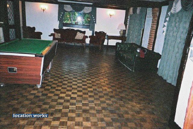 | Swimming pool and games room in the extensive grounds of a tudor-style mansion, Essex.
