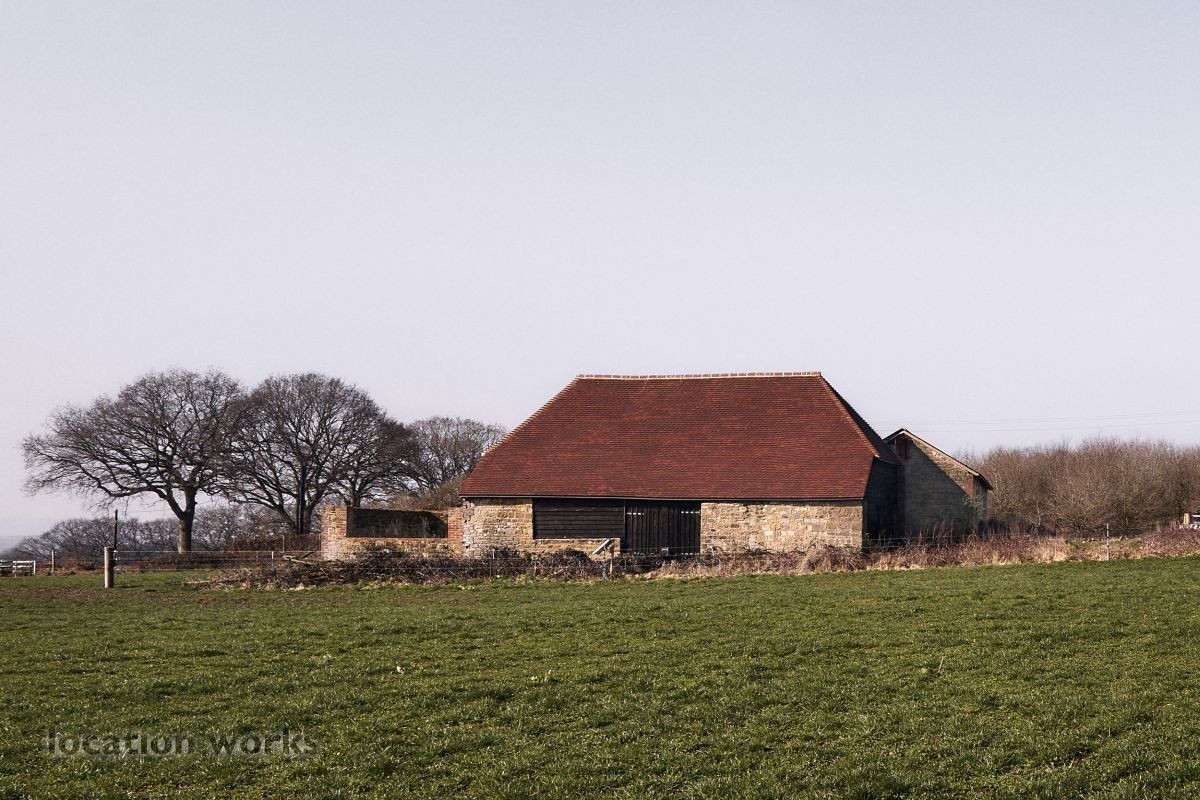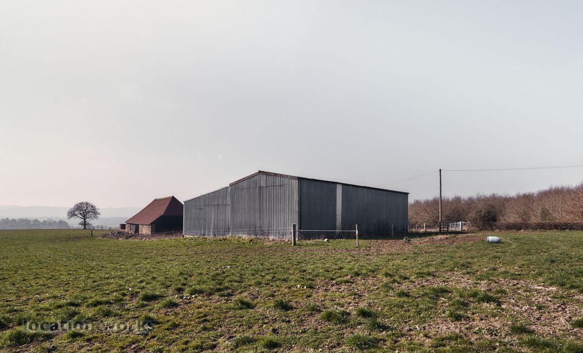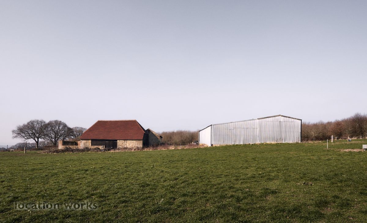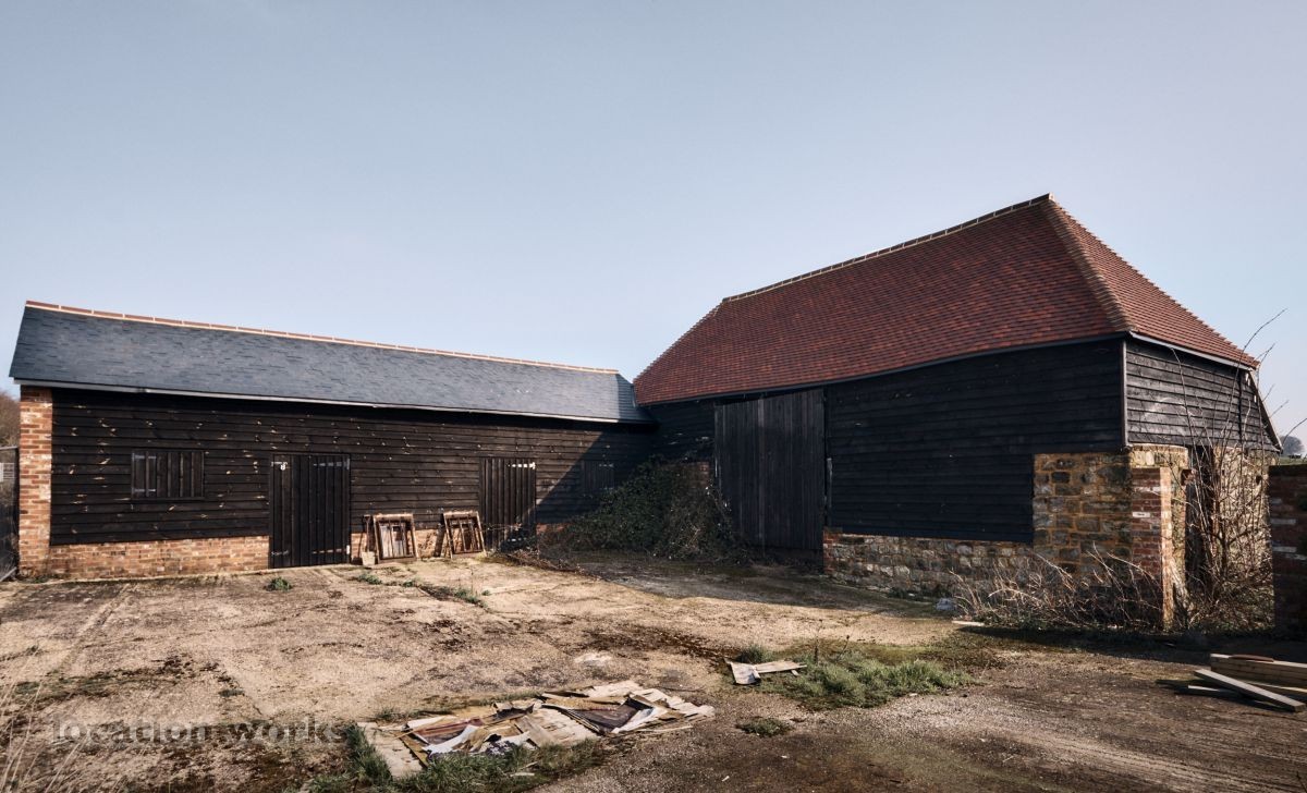 | A rustic L-shaped barn built in the 1780s with a large courtyard area and a modern, steel-framed agricultural barn. West Sussex.