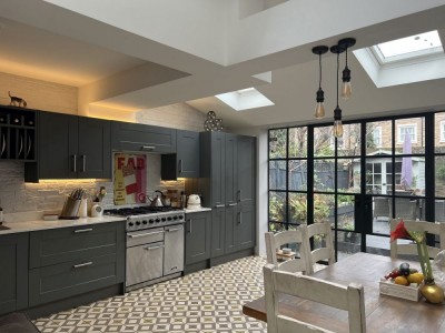 Renovated property, features a large modern kitchen/dining space with a terracotta floor and crittal doors. South west London. (new location 2024)