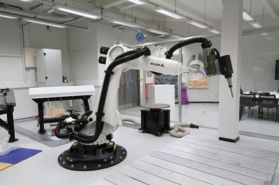 The robotics lab at London South Bank University, with a full-size programmable robotic arm. Central London.