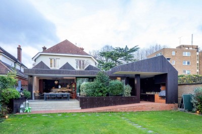 Detached double-fronted house; features an island kitchen with Schmidt units, wooden floors, bay windows, with a cedar-clad garden room and outdoor kitchen. East London.