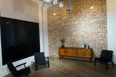Loft photographic studio with a richly textured interior featuring bare bricks and metal beams, with a props store and various colorama. Central London.