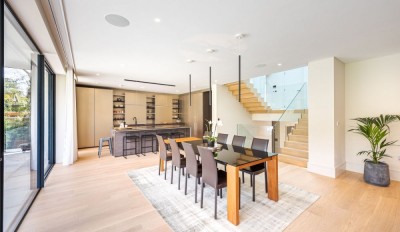 Architect designed residential house with a stylish open-plan interior, large modern kitchen, and large patio doors leading to garden. South west London.