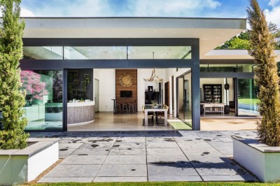 Architect-designed property, open plan with high ceilings, concrete floors, a two-acre garden, and its own private woodland. Surrey.