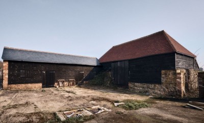 A rustic L-shaped barn built in the 1780s with a large courtyard area and a modern, steel-framed agricultural barn. West Sussex.