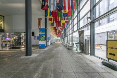 Long walkway with floor to ceiling glass wall and flags of the world. Part of a university, Hertfordshire.