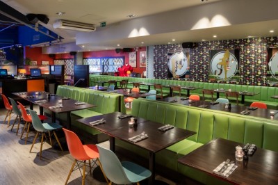 Bowling alley with trendy bars and restaurant. Manchester.