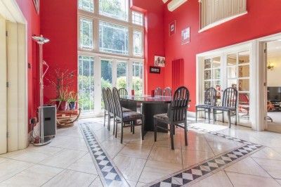 Unusual large executive home in a gated estate, centred around a striking double-height atrium. Surrey just outside M25.