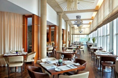 Modern stylish restaurant with a balcony overlooking the Thames, central London.