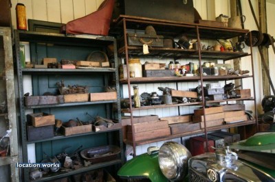 | Replica of a 1940's mechanic's workshop containing a classic MG sports car. Surrey.
